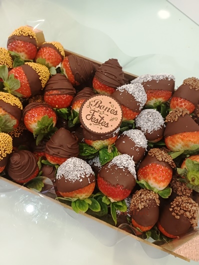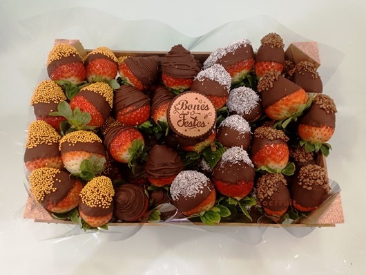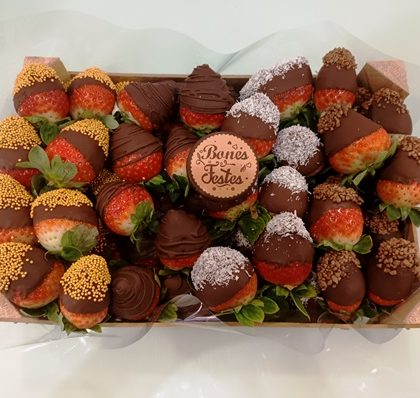 Caixa de fruites amb exquisides maduixes cobertes de xocolata negra i/o xocolata blanca decorades amb varietat de sabors.