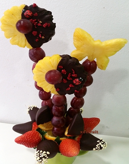 Original i divertit ram de fruita natural de temàtica floral amb alguna de les peces de fruita tallades en forma de flor i de papallona, recobert d’una exquisida capa de xocolata belga i decorat amb sorprenents sabors. Amb poma àcida, pinya, raïm, taronja i maduixes. Ideal per obsequiar, agrair o tenir un detall amb una persona especial.